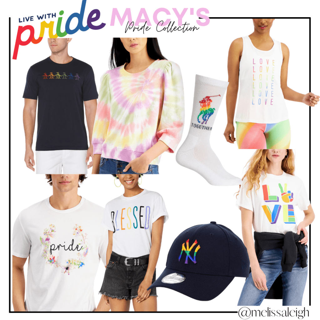 Men’s Pride Rainbow Pete Embroidered Logo Graphic T-Shirt//INC Tie-Dyed Sweatshirt//Ralph Lauren Pride Crew Sock//Women’s Pride 2021 Tank Top//INC Unisex Floral Pride T-Shirt//Junior’s Cotton Blessed T-Shirt//New York Yankees Pride 39THRITY Stretch Fitted Cap//Junior Cotton Love Graphic-Print T-Shirt