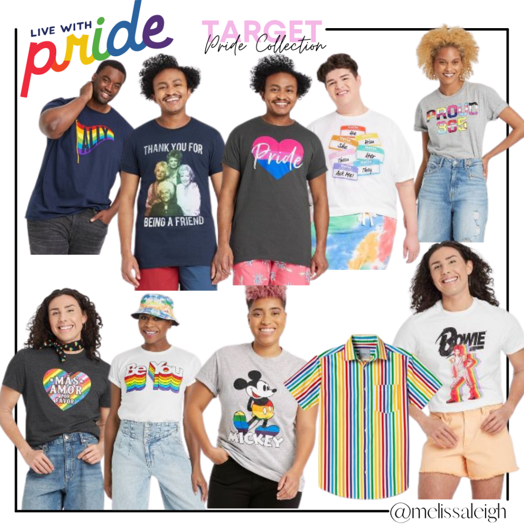 Pride Gender Inclusive Graphic Adult “Ally” Short Sleeve T-Shirt//Pride Golden Girls Tee//Bisexual Flag Heart Tee//“Pronouns” Tee//Proud 365 Tee//“Mas Amor Por Favor” Tee//“Be You” Tee//Mickey Mouse Tee//Striped Rainbow Button Down//Pride David Bowie Tee