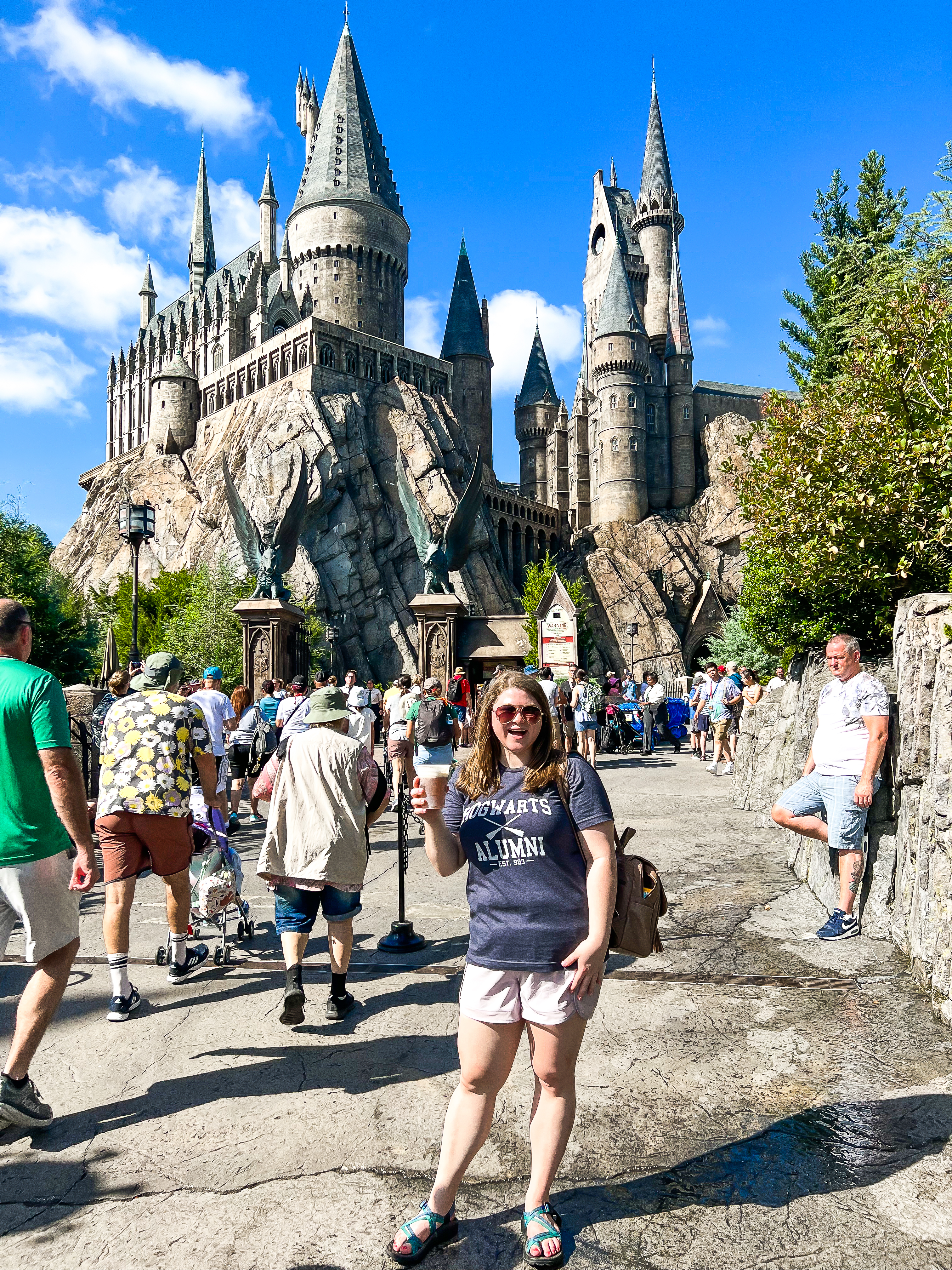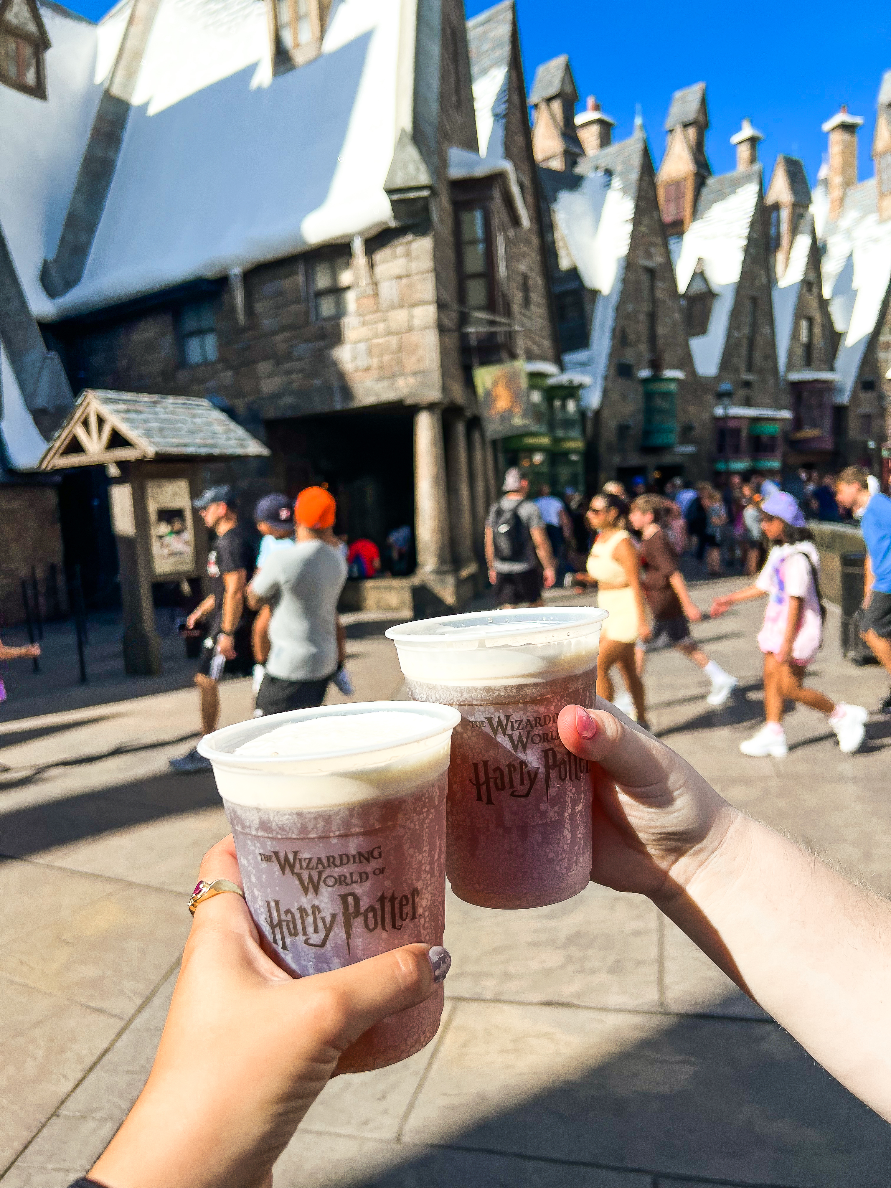Walking through Hogsmeade and making sure to take in all of the magic, we leisurely made our way through the Wizarding World. As we walked through the area, we saw that the line for Butterbeer was really short and decided to take advantage. Now, full disclosure, the last and only time I had a Butterbeer was at the Harry Potter and the Cursed Child play in New York City. That version did have alcohol (butterscotch schnapps) in it. That said, I definitely thought that all Butterbeer had alcohol in it and was very confused when there was no choice between a non-alcoholic and alcoholic Butterbeer. Mary Ellen definitely got a giggle out of my assumption. Luckily, our 10:00AM Butterbeer was alcohol-free, and we were energized to explore the rest of the world.