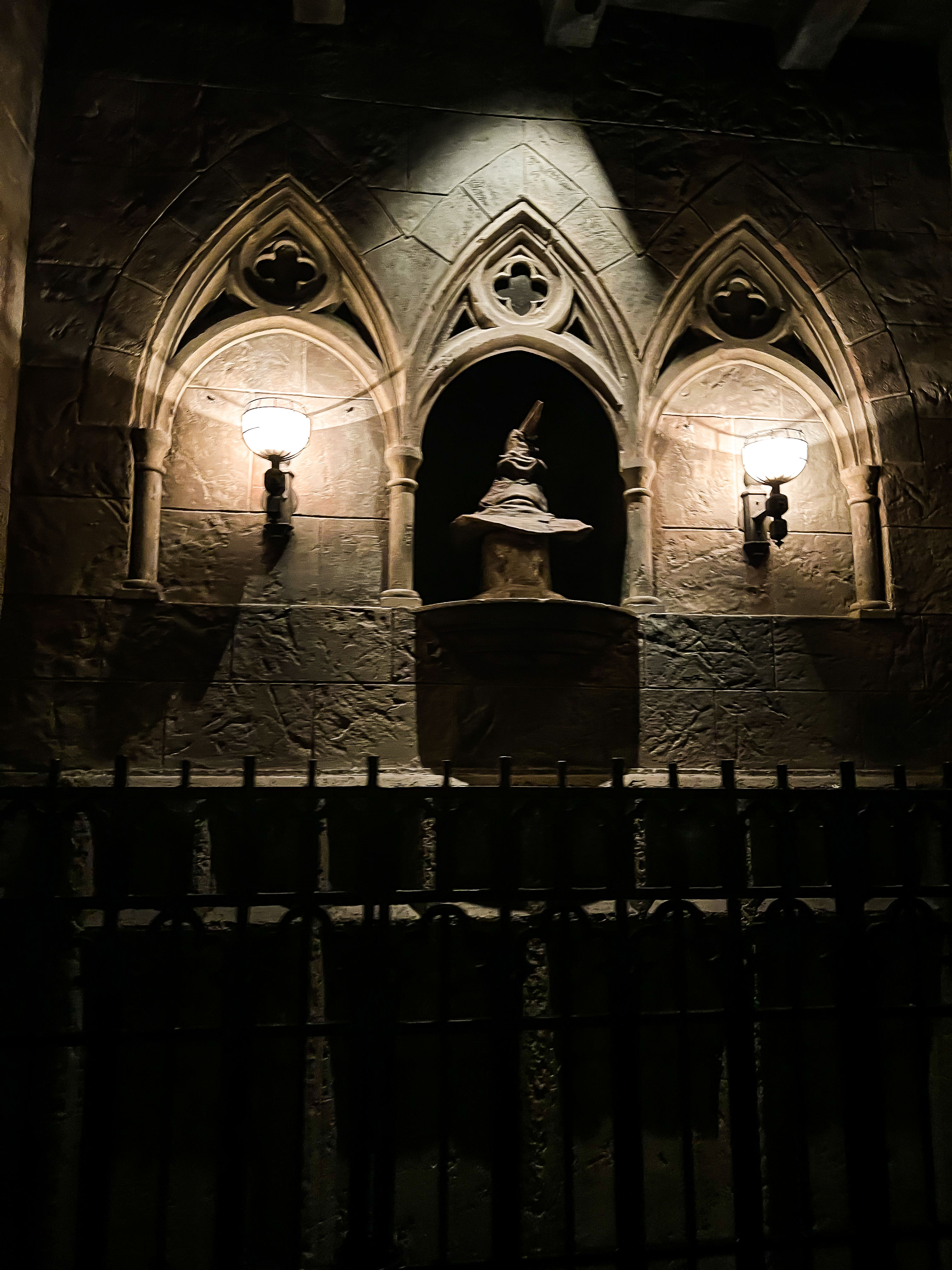 Once we arrived at the castle, we saw it was a 20 minute wait for the ride and decided to jump on it. What’s great about this ride is that the queue is interactive and entertaining. You weave through the greenhouse and head into the castle where you interact with Dumbledore, the Sorting Hat, and even the golden trio: Harry, Ron, and Hermoine.