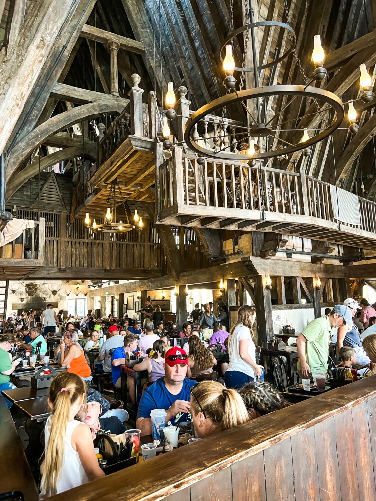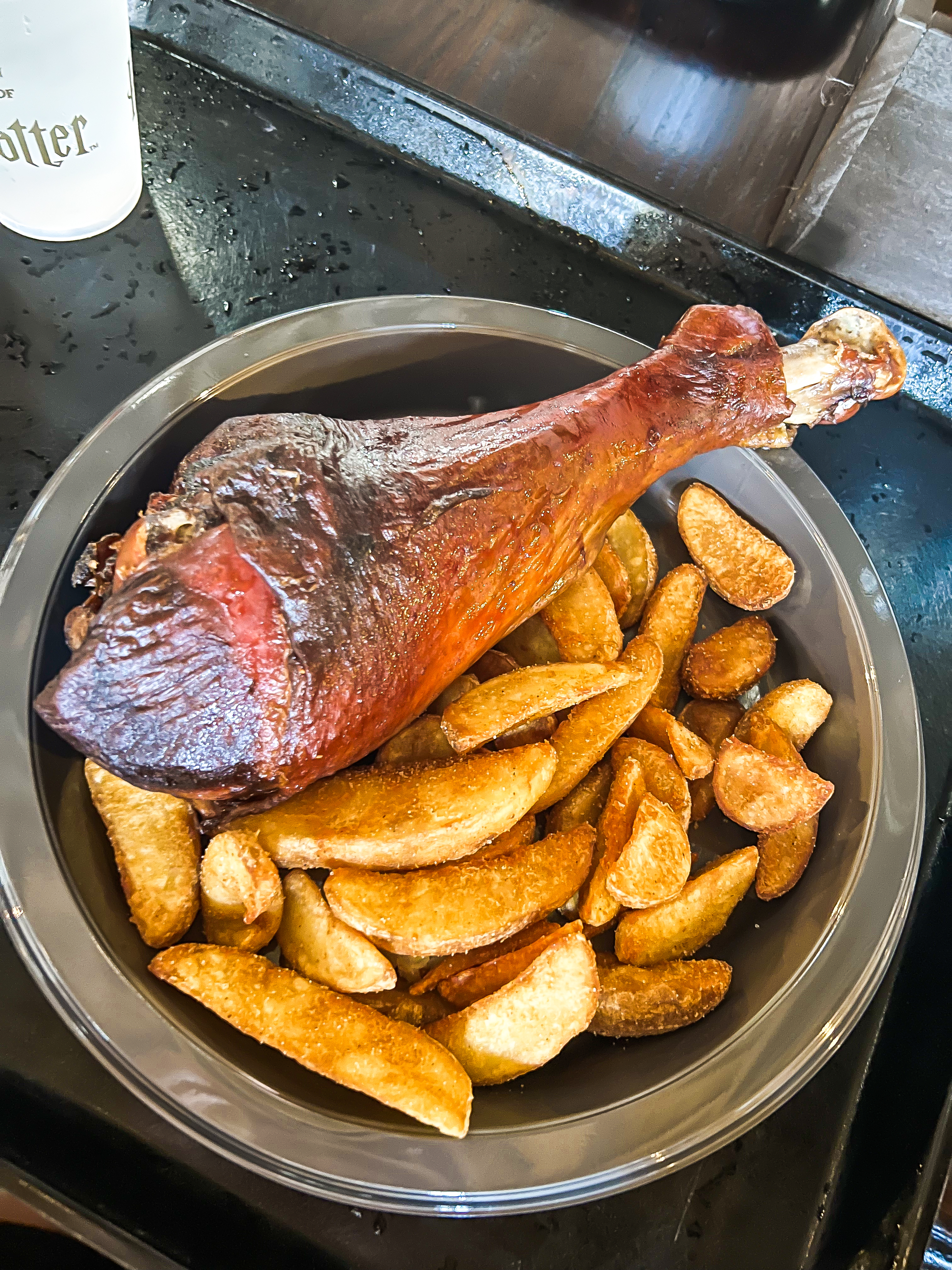 After finishing Hagrid’s Magical Creatures Motorbike Adventure, we decided to finish our time at Harry Potter World in the best way – with lunch at The Three Broomsticks! The Three Broomsticks is a quick service restaurant that offers breakfast and lunch daily. The menu was a wide variety of British staples including shepherd’s pie and fish and chips with American classics like ribs, turkey legs, and rotisserie chicken. As you go through the line to get up to the register to order, they display each item as it’s served. I changed my mind on what I wanted at least five times while going through the line (especially when I saw the meal displays!).