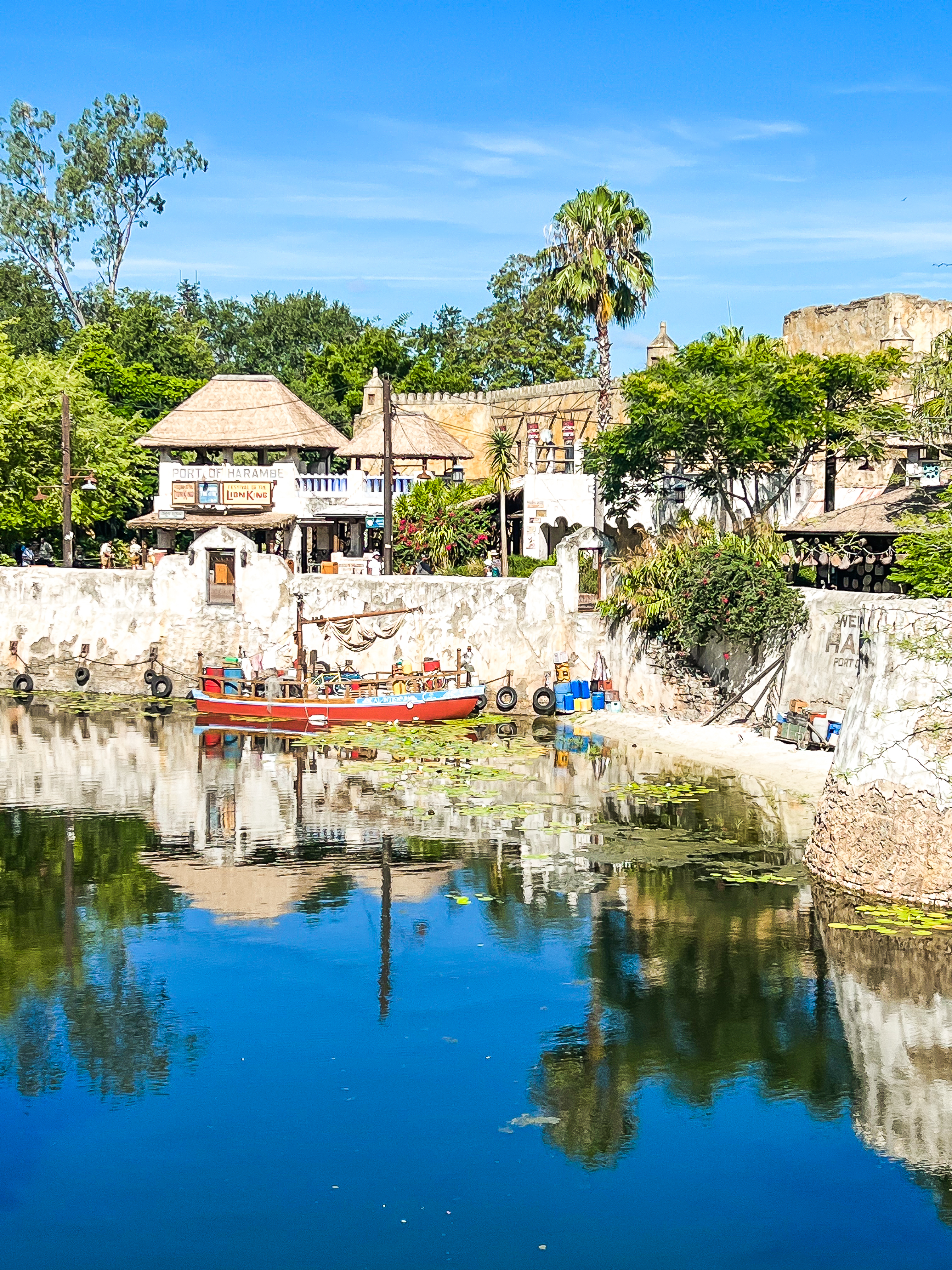 From Discovery Island, we walked over to Africa, where we discovered a very cool hidden photo opportunity. If you’re not looking for it, you would just walk right past it. The spot is located near the Harambe market. Around a corner, you will find vintage-looking Mickey art on the wall next to a bike and a red umbrella cart. You can definitely get some cool photos in this spot, but we just got one photo super quick because we were about to hop on the Kilimanjaro Safaris since the wait was only twenty minutes.