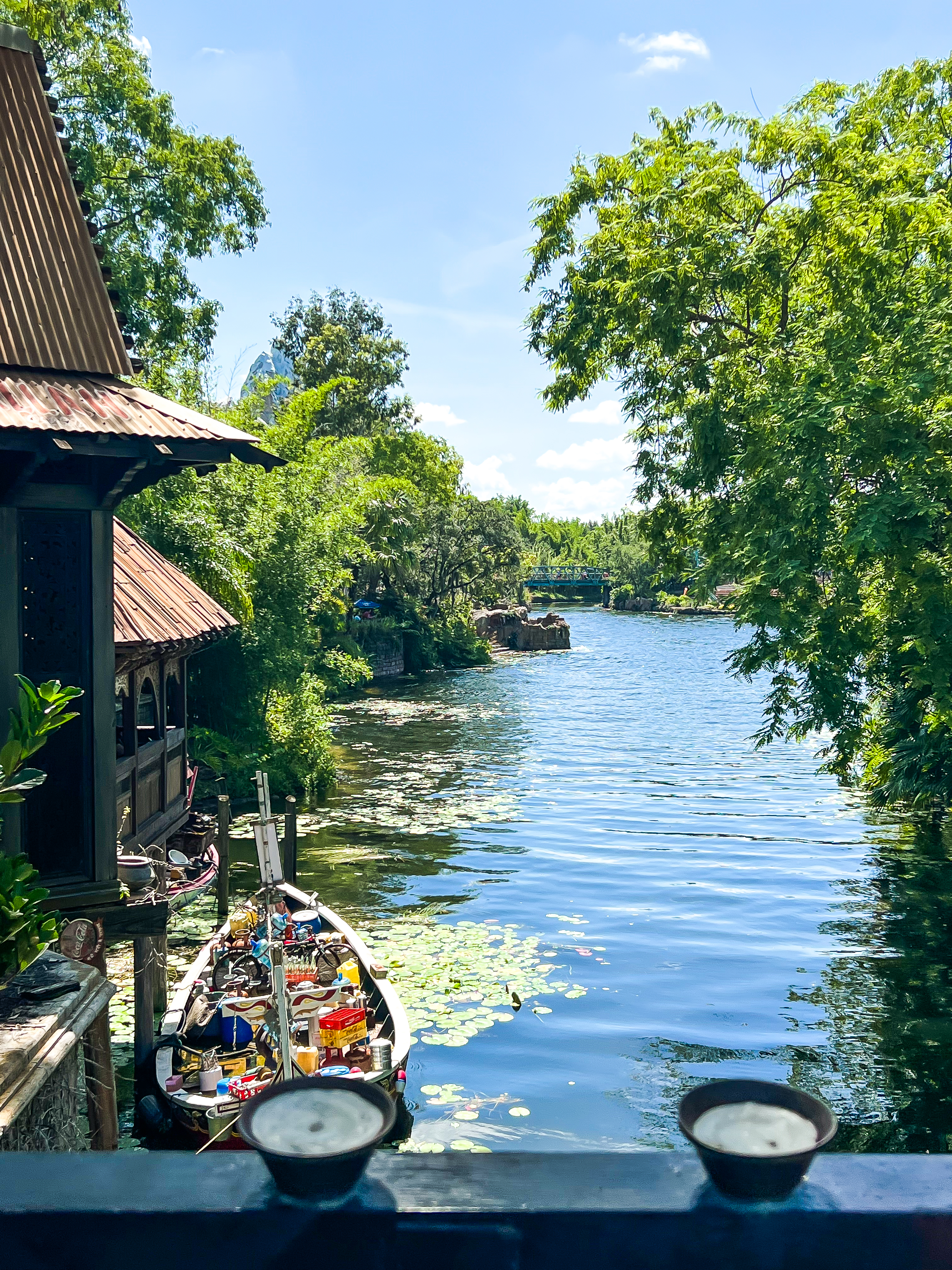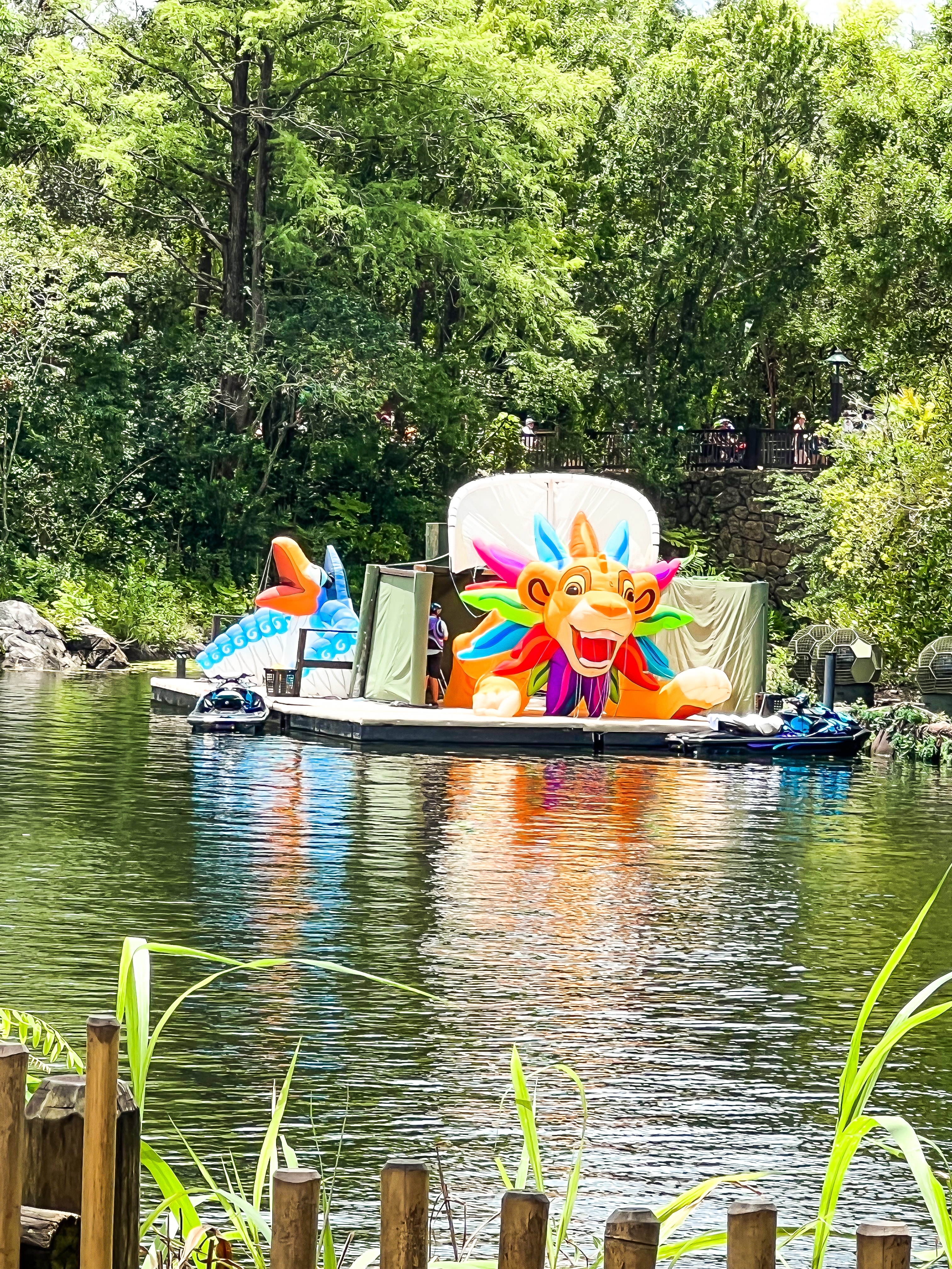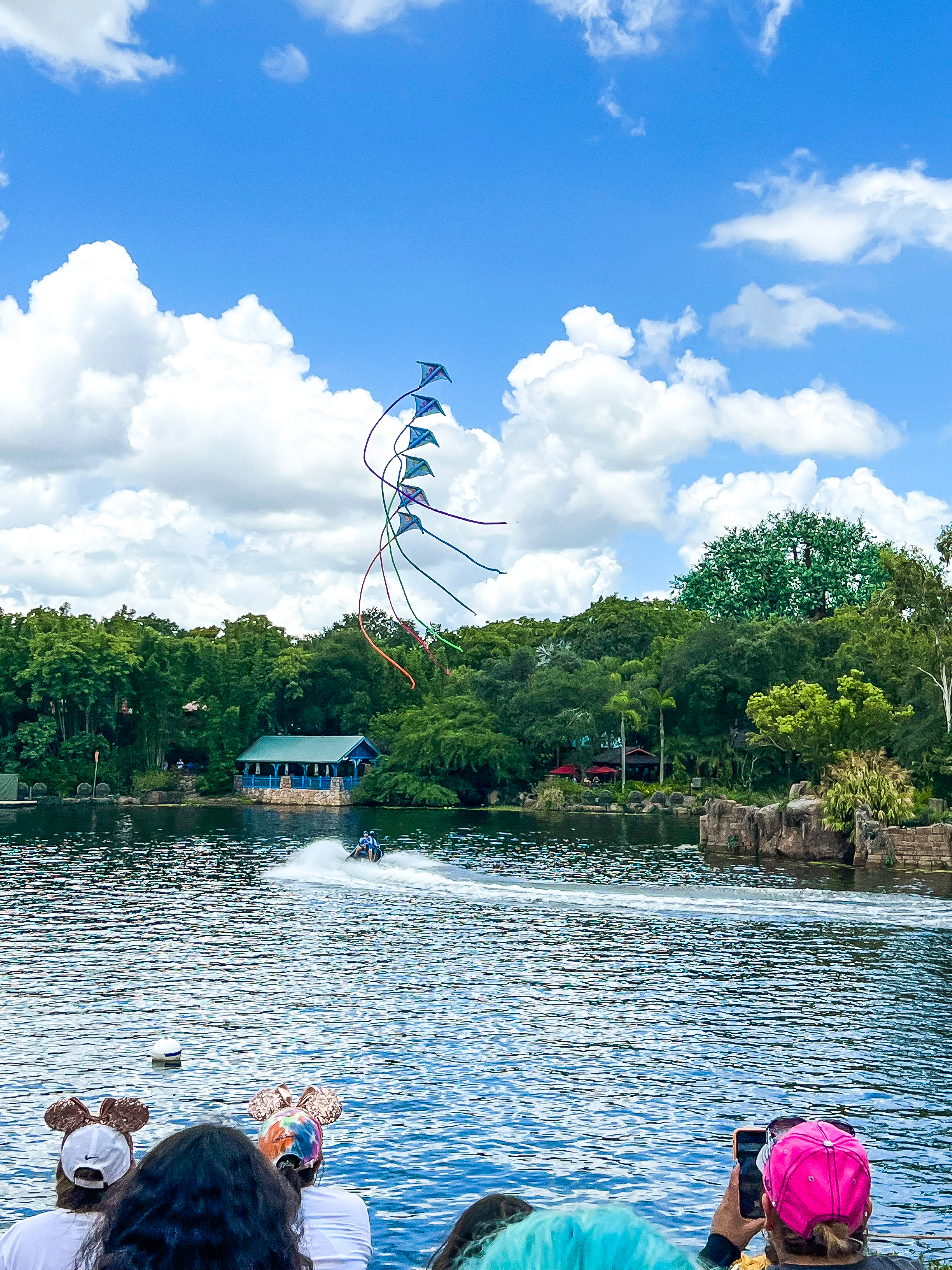 After finishing Expedition Everest, we walked across the way and watched in a performance of Kite Tails. The show was a 50th Anniversary offering performed on the Discovery River. The show was a short water and air show created for the Most Magical Celebration on Earth. Shows alternated between The Lion King and The Jungle Book. Cast members on jet skis flew kites shaped like favorite Disney characters around the lagoon to music from their respective movies. I read that Disney had originally planned for Kite Tails to run only a few times throughout the day, but based on popularity performances were increased to every 20-30 minutes (and because they alternate, we got to see both versions). Unfortunately, there were too many logistics that needed to be ironed out for Kite Tails to continue. With that, Disney decided to not only discontinue the show at the close of the the 50th Anniversary celebration, but to close the show much earlier than originally planned. All that said, we greatly enjoyed watching Kite Tails from the amphitheater and later from the outdoor seating area of our lunch spot.