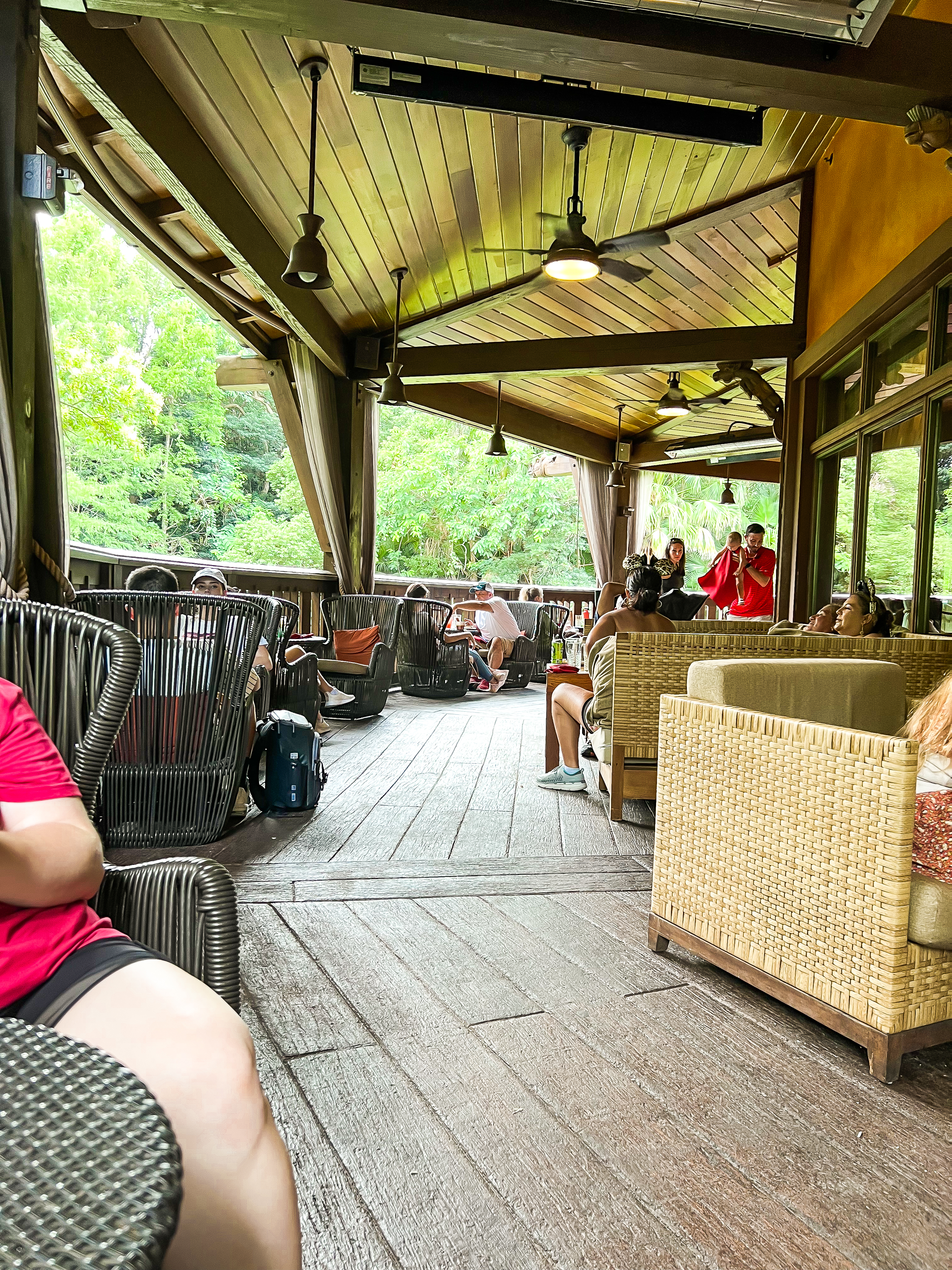 From DinoLand, USA, we made our way to the Nomad Lounge, which is a lounge associated with the Tiffin’s restaurant. The restaurant and lounge are on Discovery Island right across the bridge from Pandora. We used the walk up waitlist feature of the Walt Disney World app to put our names on the list for the lounge. It was super easy to use and convenient. Once we put our names down, we were given an estimated wait time, which was about how long it took for us to walk from DinoLand to the lounge. Mary Ellen got a text that our table was ready and we were seated right away on the patio. My only complaint is that we didn’t have that great of a view of the water to watch the Disney characters come by on their “Floatillas”.