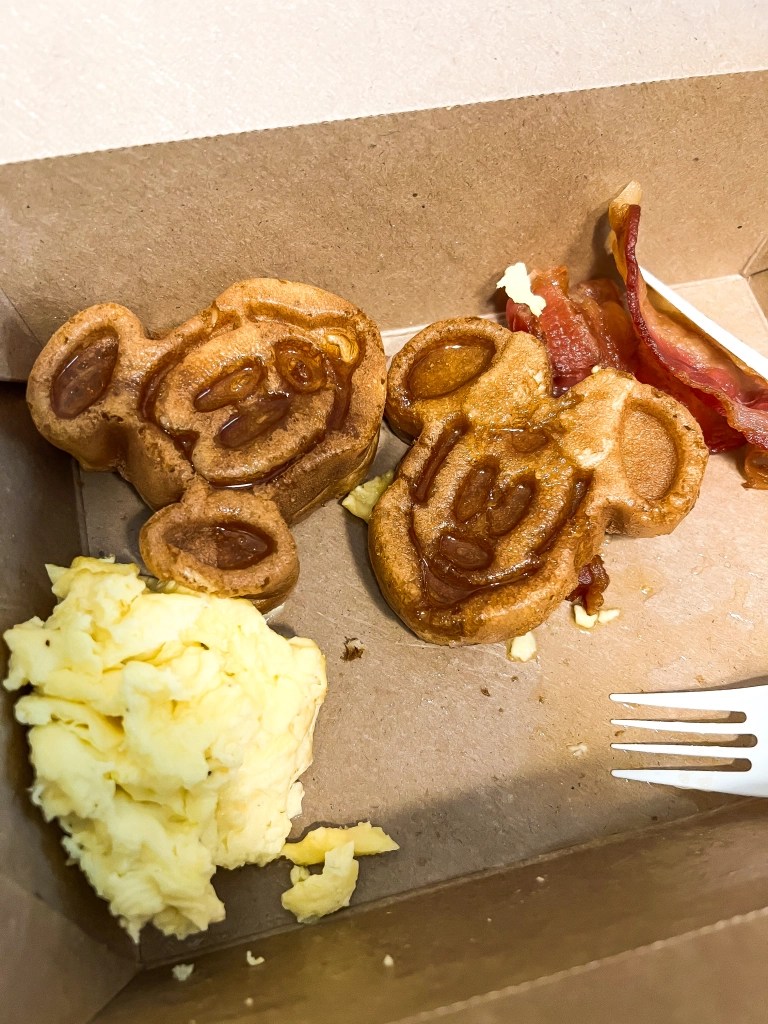 We slept in until about 8 AM and decided to order our breakfast to go from Oliviaās CafĆ© at Old Key West using the mobile order feature of the Walt Disney World app. We both ordered Mickey waffles with eggs and bacon. The Mickey waffles were delicious as always! We got ready and left our room to catch the bus over to Typhoon Lagoon, but when we got to the bus stop we were a little confused about how to get to the park. At the time were were in Disney World, there wasn’t a direct bus to Typhoon Lagoon from the resort hotels. However, there was a note on the bus board saying that all guests going to Typhoon Lagoon should go to Disney Springs and then transfer to a bus headed to Typhoon Lagoon. We decided that since it was a beautiful morning and we had the option, we would take the boat over to Disney Springs (like we had on night one) and then transfer to the bus. This might have been the wrong choice since we had to cross half of Disney Springs to get to the bus stop and we were both dressed only in swimsuits and cover ups.