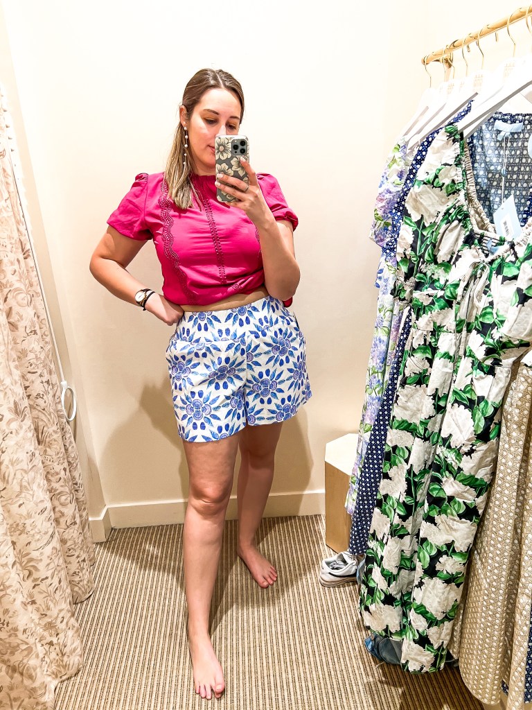 Hill House released these shorts with their big spring drop earlier this year and after seeing the shorts in a different pattern a few months ago, I was definitely curious to see how they fit on me. I love wearing shorts in the summer and an effortless style of a smocked/elastic waistband helps make them so comfortable to wear. I tried on my normal smocked size of Medium in these shorts and they fit okay but were definitely tight across the hips. Sizing up to a large allowed there to be more room in the thighs, so my suggestion is to wear your normal non-smocked size in these shorts.