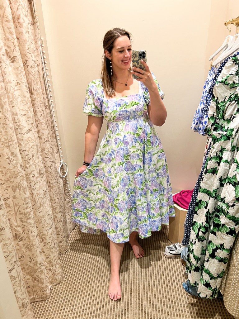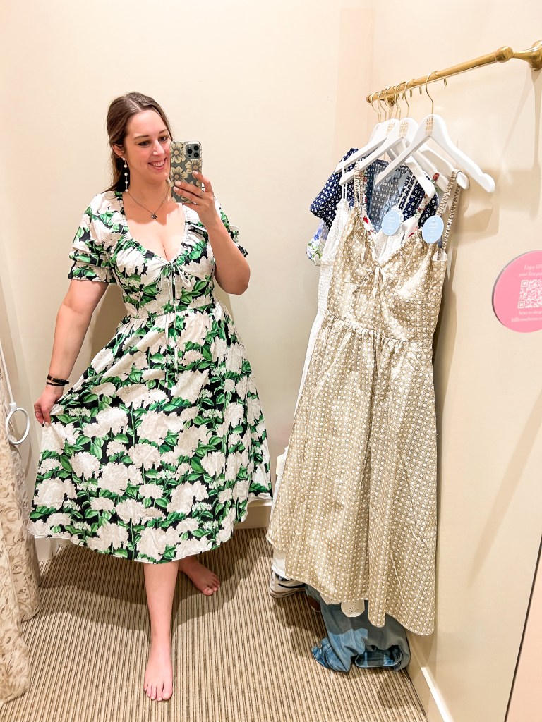 Without rambling too much, here are the new styles I tried on in store and how it fit on my midsize body. Just a reminder, I am 5’8, 170-180 lbs, normally a size 10-12 (medium/large) and an hour glass shape. My normal hill house dress size with smocking is a medium and without smocking is a large. All the prices and sizing availability is accurate to the time of the publishing of this post.