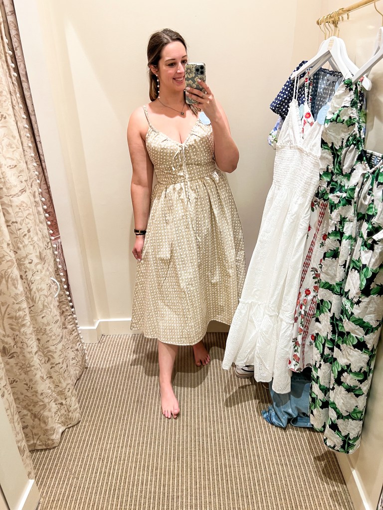 This dress was definitely one of my top favorites from this try on for the Summer Collection. The Juliana is very similar to the Ophelia dress, but it doesn’t have the puff sleeves on it. It still has the sweetheart neckline and the triangle waistband to highlight the waist. I also love this sand basketweave color, it’s a fun neutral pattern for any neutral lovers out there. The only part of the dress that I didn’t like that would make me hesitate getting it is that the zipper is in the middle of the smocking on the back and it was difficult to pull it up. I eventually gave up and didn’t want to push it too hard because I was only trying it on in the dressing room and didn’t want to break the zipper or the dress. I tried this dress on in a size Large.