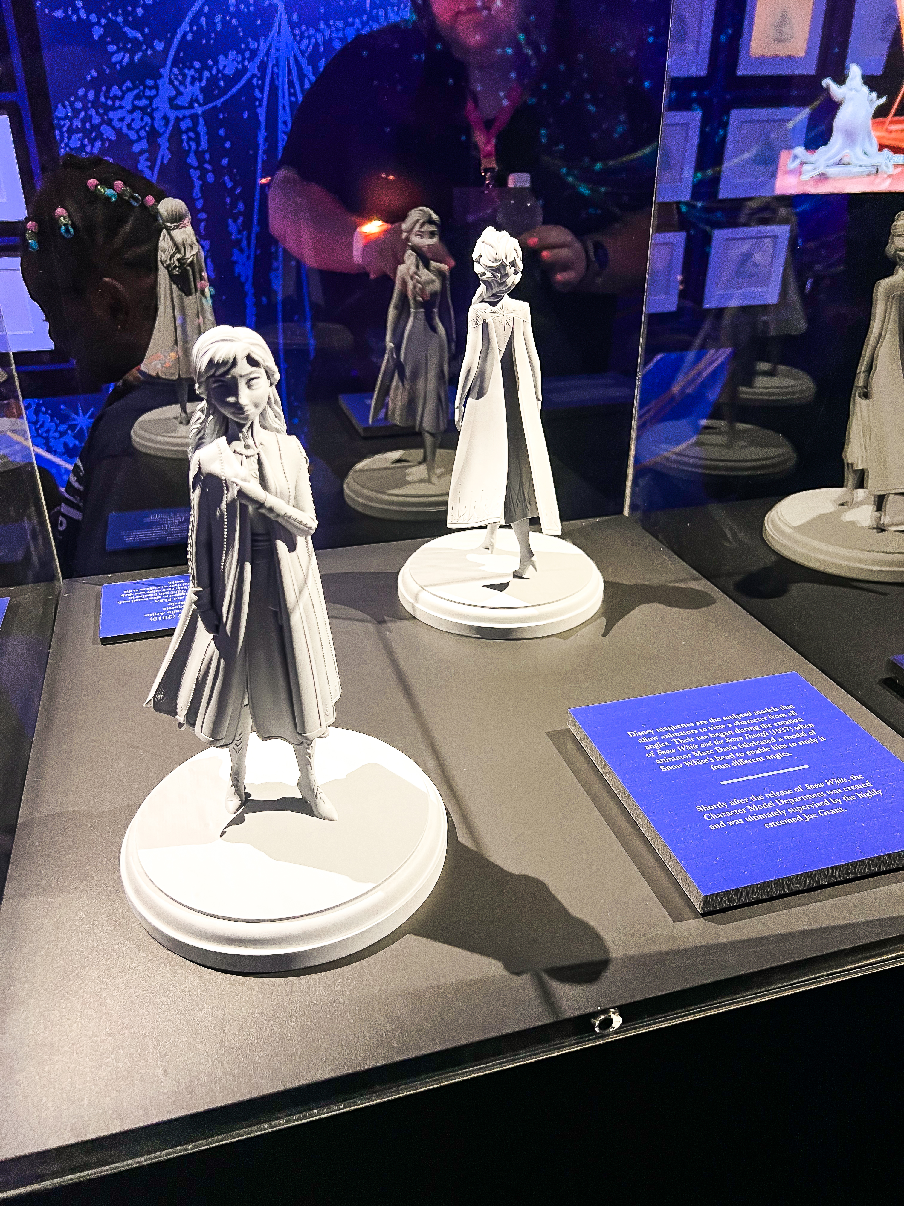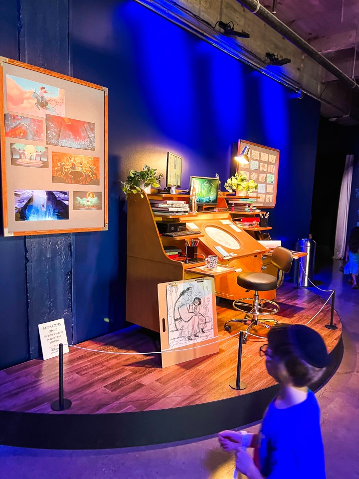 The first part of the exhibit is an area that showcases the process of creating animation and shows how the art has changed through the years. The first exhibit shown is the desk that mimics what an animators desk would look like as they are working through different projects. From there, you step into a gallery with numerous displays. The first wall display to catch my eye was the different sketches drawn out to create Cinderella’s iconic transformation into her dress for the ball and in the middle of those sketches were two screens – one showing the animation as a sketch and one showing the completed animation as seen in the movie. On the other side of the wall, they also had a blown up version of the same two type of videos, but this time with Aladdin and Jasmine on the magic carpet.