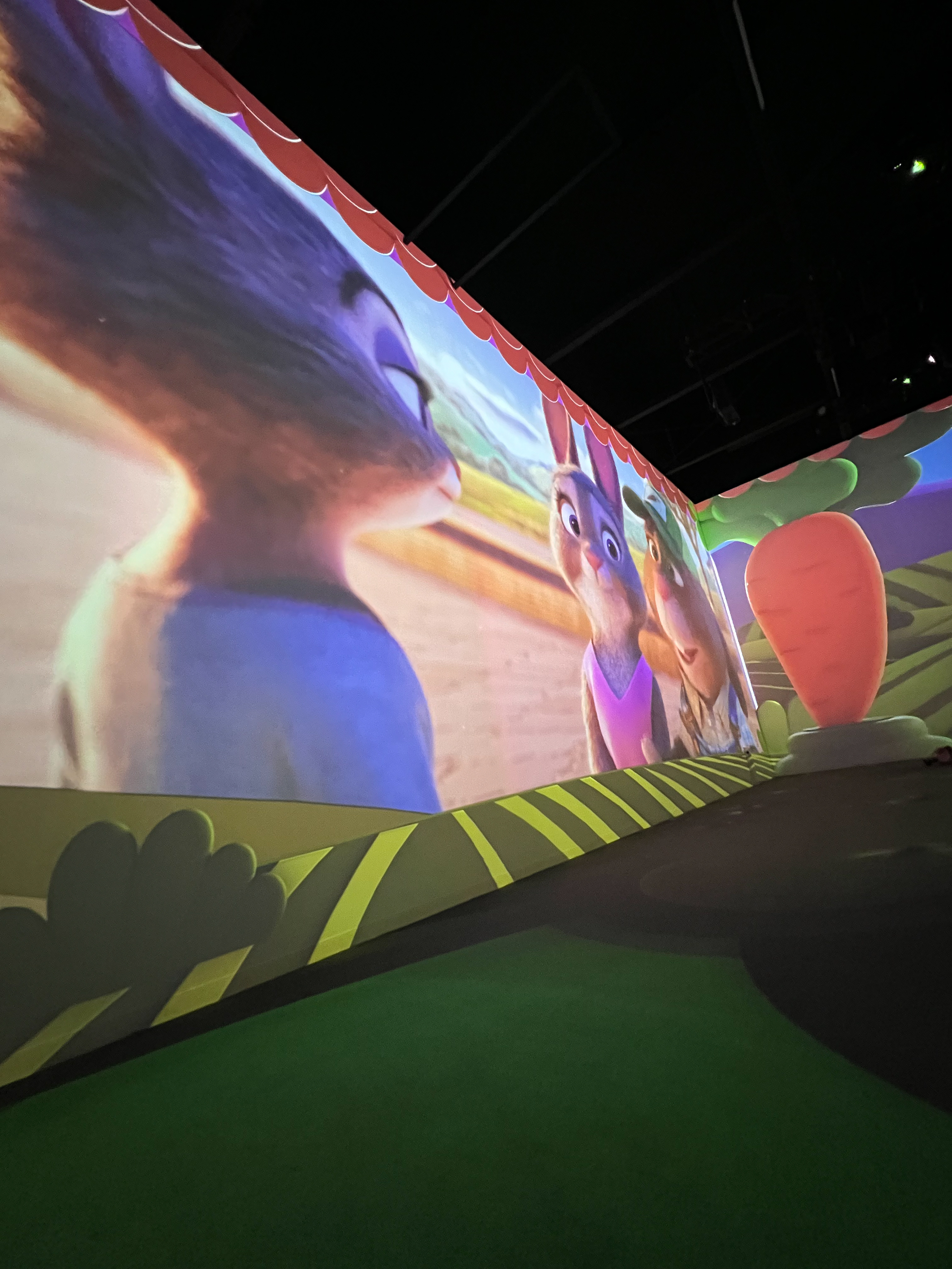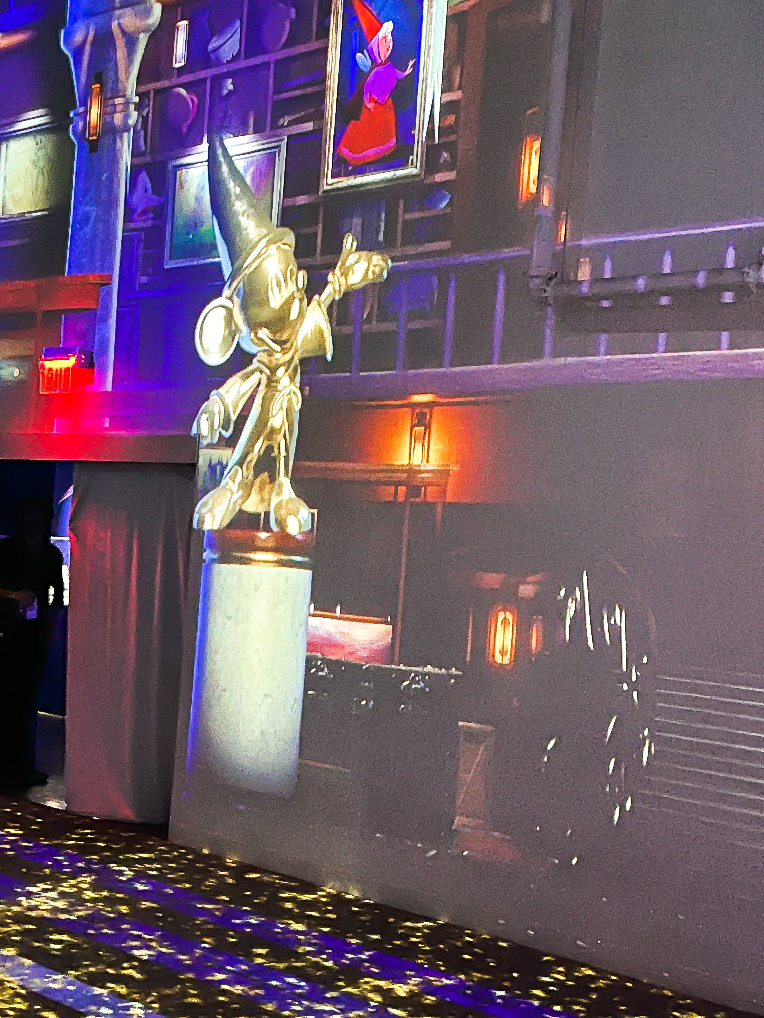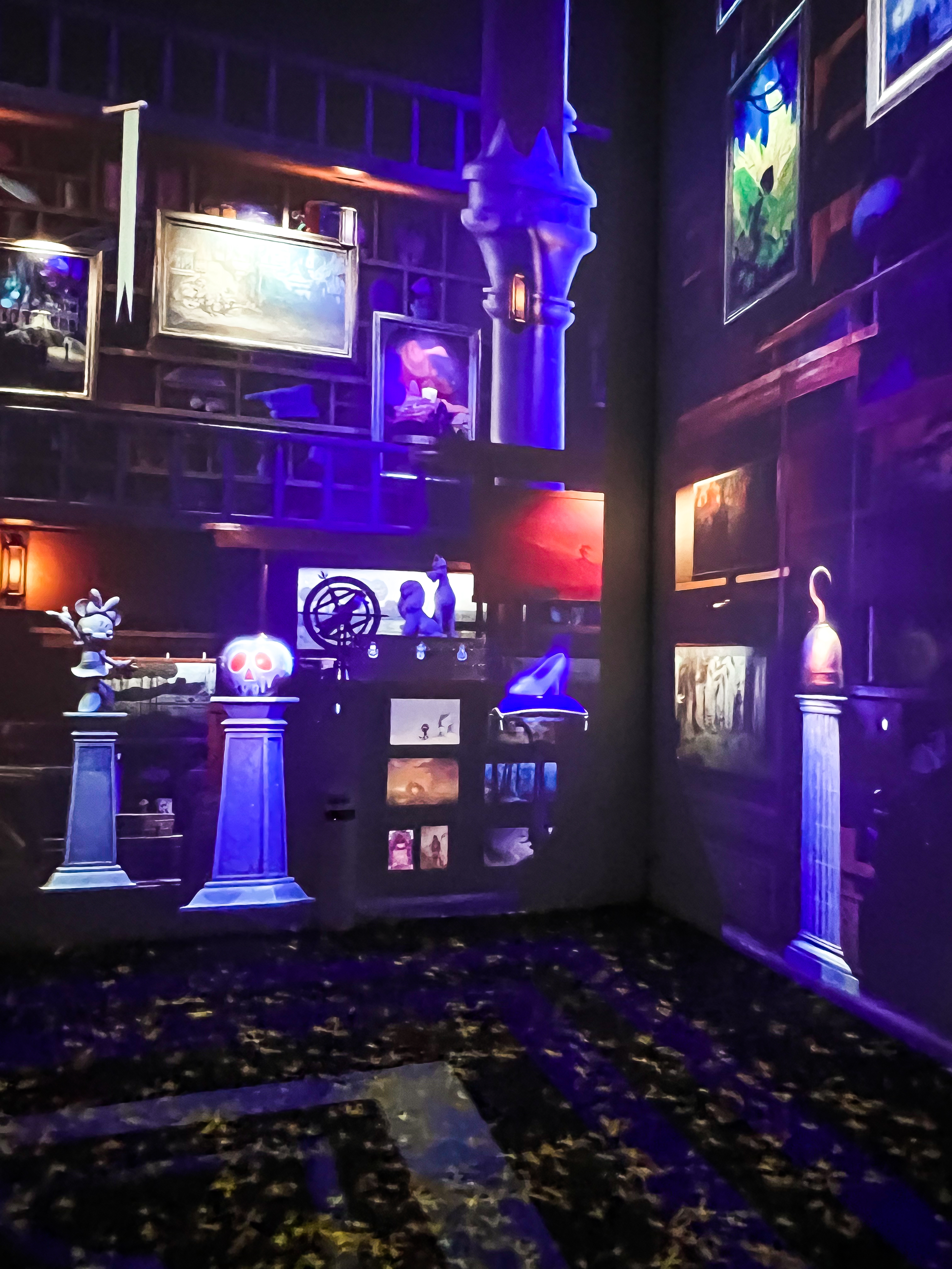 When the time arrived, we were able to enter a “vault.” This led us to the room that the show was taking place in. The scene that was projected onto the walls before the show started was similar to a library or collector’s gallery holding numerous props from different movies and pictures from scenes of movies. What I loved most about this immersive experience is that the floor was interactive, too. From the moment we stepped into the room the interaction began. For the opening scene and the wait before the show, there were stars on the floor that moved around with you to make you feel like you were immersed in Disney magic or pixie dust.