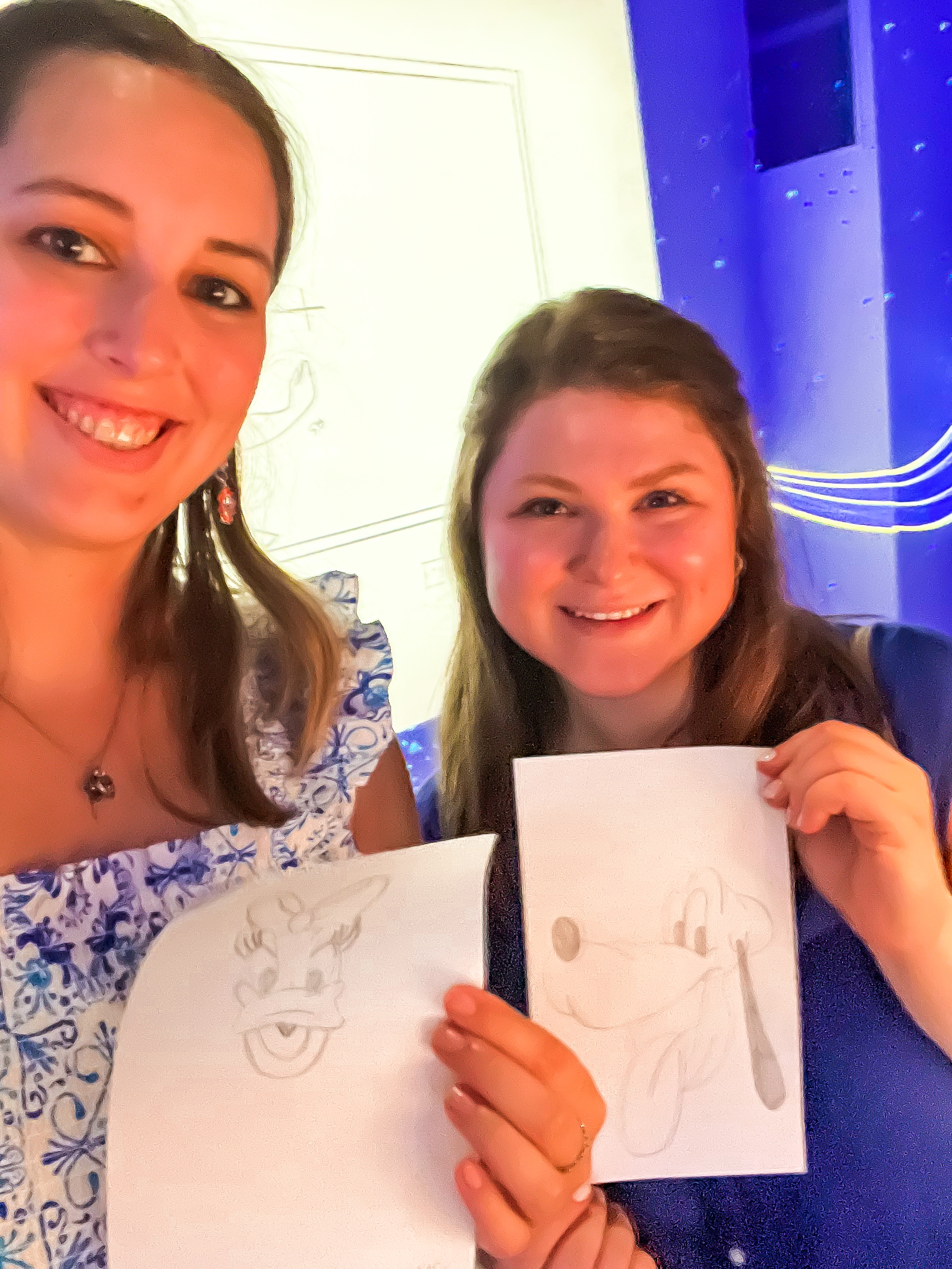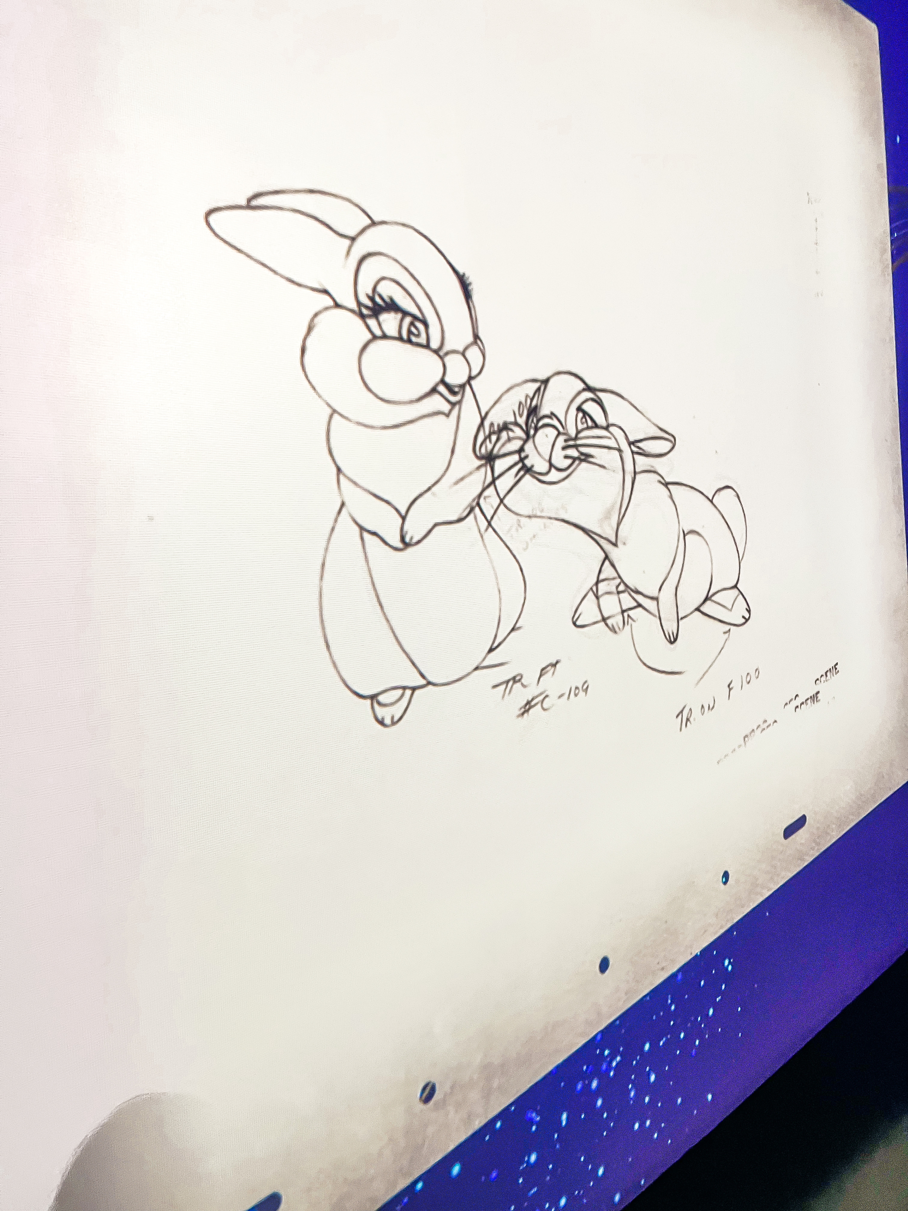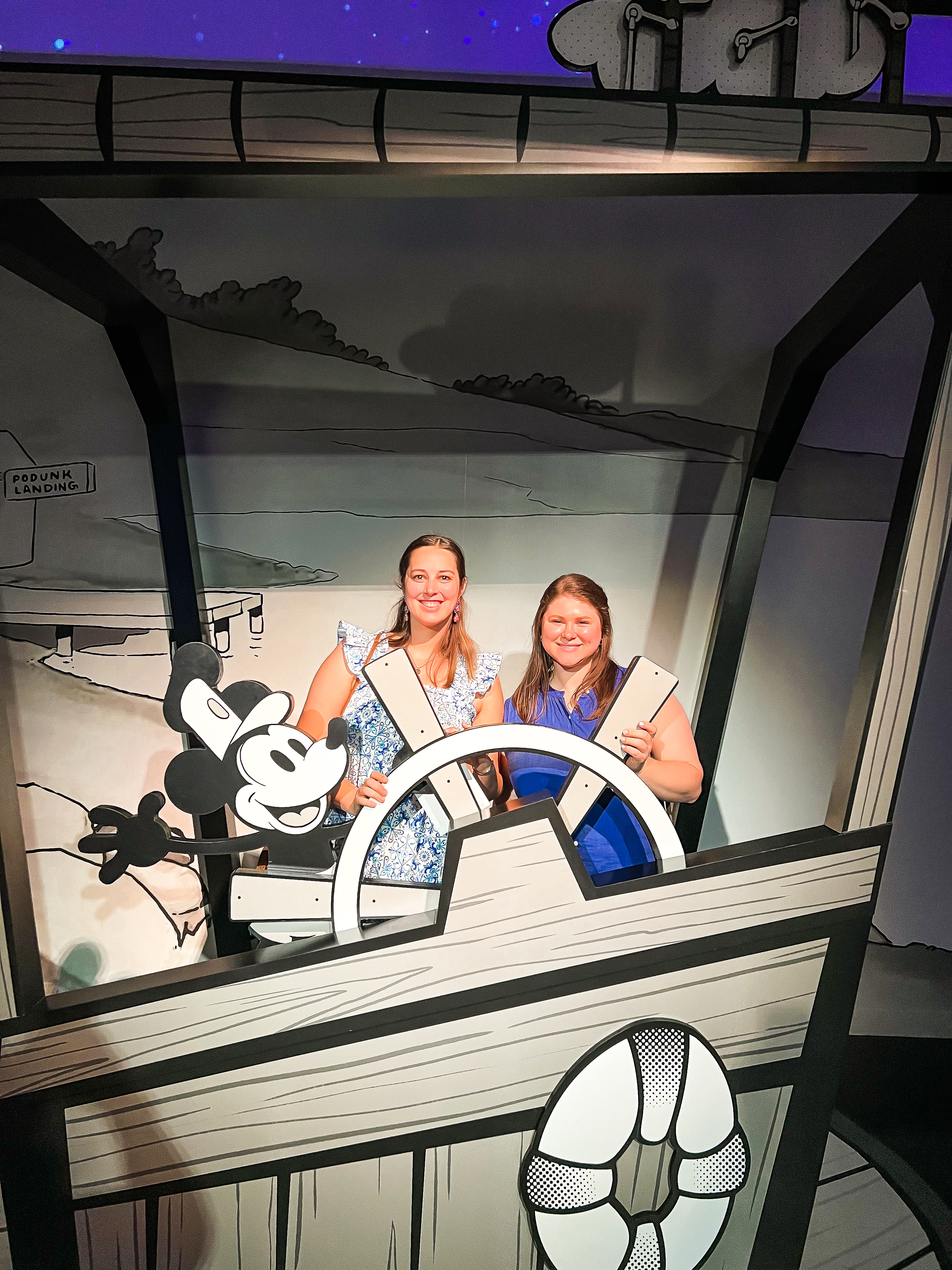 Once the immersive show is over, you then move to a room full of tables with paper, pencils, and instructions for drawing various Disney characters. You are encouraged to try your hand at drawing a Disney character, which is kind of hard, but still loads of fun. They have a step by step instruction of how to draw each character next to a clipboard full of paper. I choose to try drawing Daisy Duck, while Mary Ellen decided to draw Pluto. I think overall our drawings turned out pretty decently. While you are taking your time drawing your character, the walls are playing clips of different animation sketches of Disney movies such as Bambi, and Beauty & the Beast. There is also a photo opportunity in this room where you can stand at the wheel of the steamboat from Walt Disney’s first animation creation, Steamboat Willie.