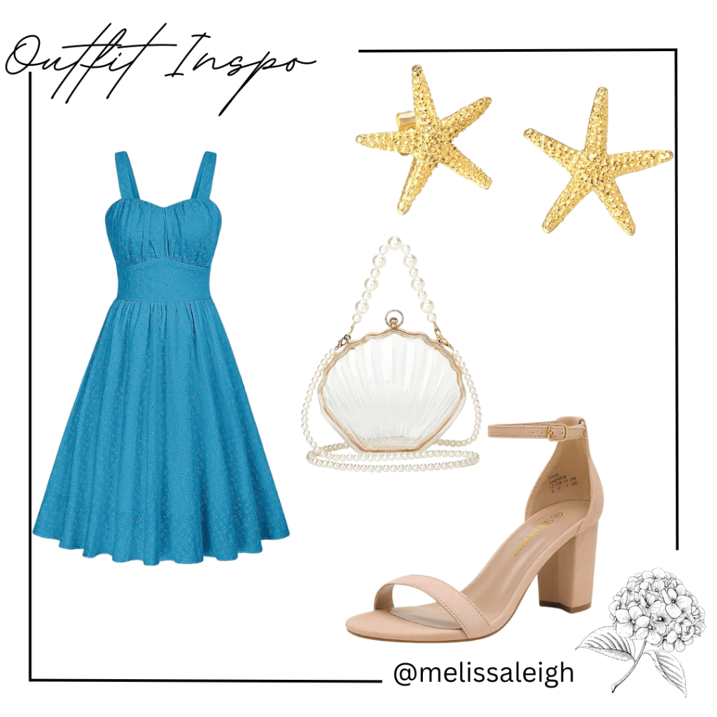 Ariel was a hard one to come up with an outfit for. She has so many colors to choose from – dark purple (sea shells), green (fin), pink (movie ballgown), and turquoise (her dress in the Disney parks). I decided to go with dark purple for my outfit, mainly because I wanted a reason to share this dress again and because purple and green are the two colors I associate first with Ariel.