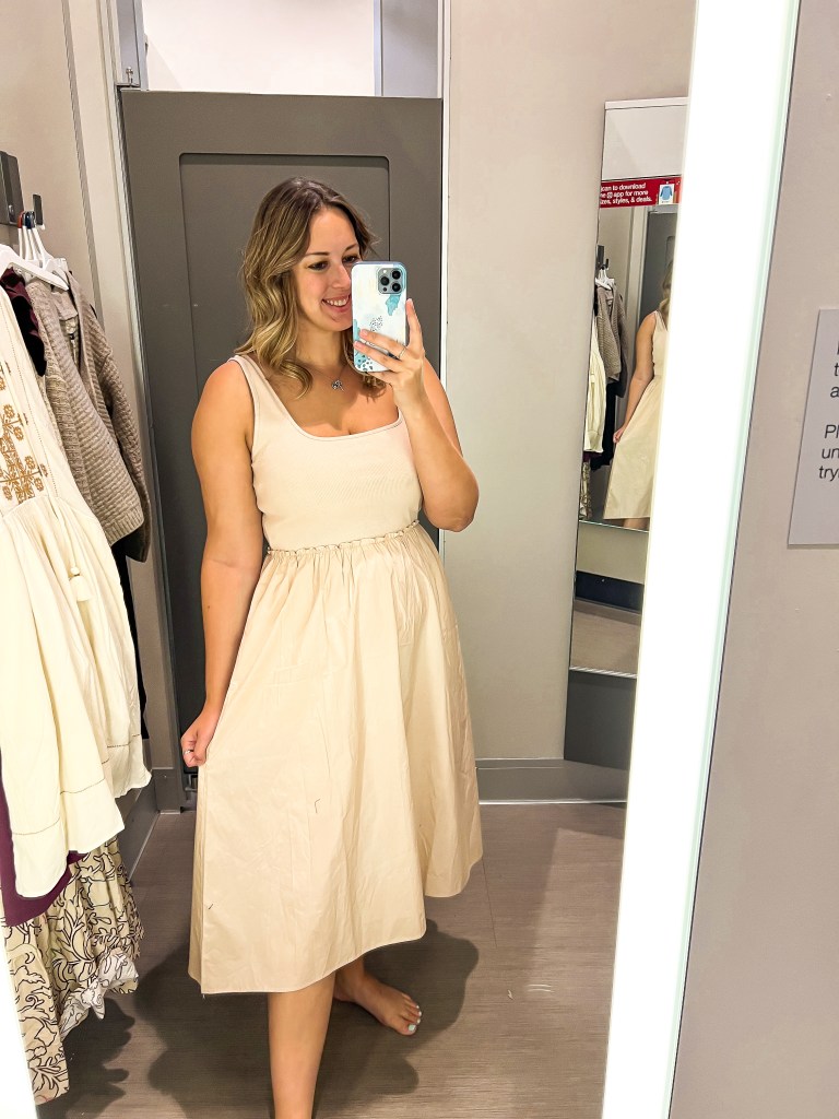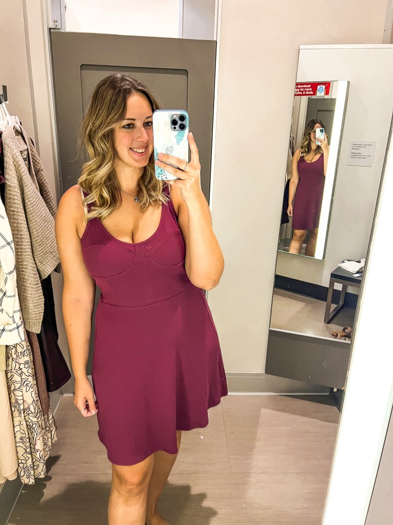 I shared this dress a few weeks ago in a product collage and knew I had to try it on when I saw it was in stores. Such a cute and classic take on the popular ballerina dress, with a fitted top and flow skirt created by a high low design. The top part of the dress is a ribbed cotton material, while the skirt is a more polyester material. Bonus: It does have pockets! This dress was also available in stores in a black and hot pink color, but more colors are available online.