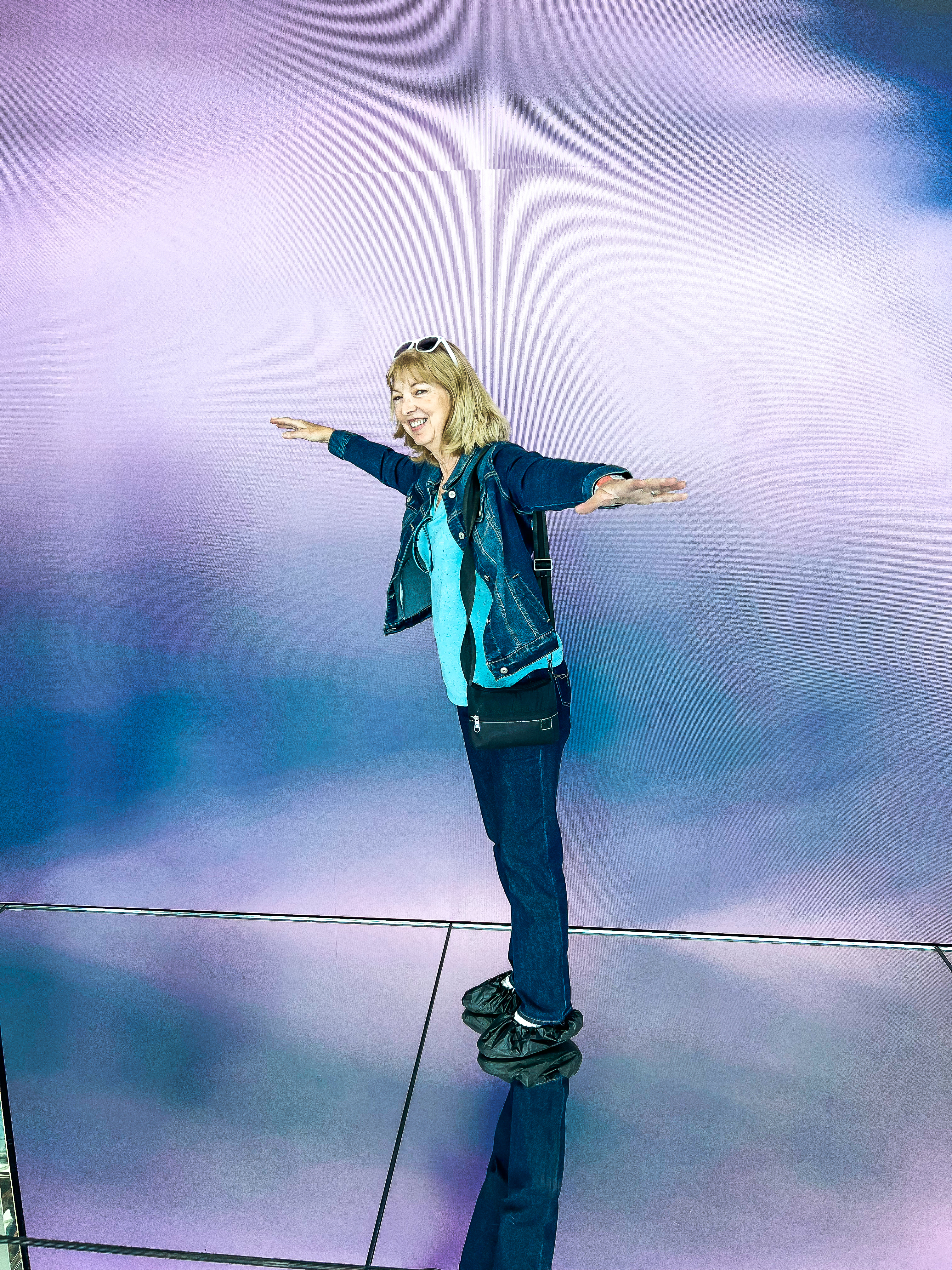 After a fun time shopping at Hill House, we made our way back to One Vanderbilt to get in line for the experience. It was definitely an interesting process – we had to go through security points multiple times on the bottom floor. You have to get your picture taken for a special part of the immersion experience, pick up glasses to help with the glare, and put coverings over your shoes to prevent damaging the glass floors. We also got wristbands with QR codes so we could take pictures from the official photo points throughout the journey. From there, you move into another line to wait for an elevator to take you up 91 floors.
